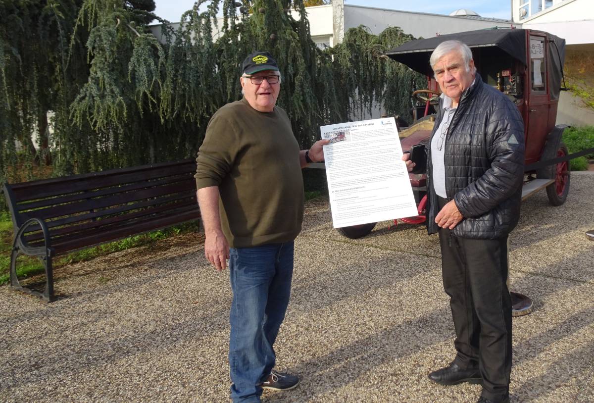 Les Amis de La Martinerie offrent un panneau de présentation du taxi de la Marne à Jacques Bauché, propriétaire du Taxi