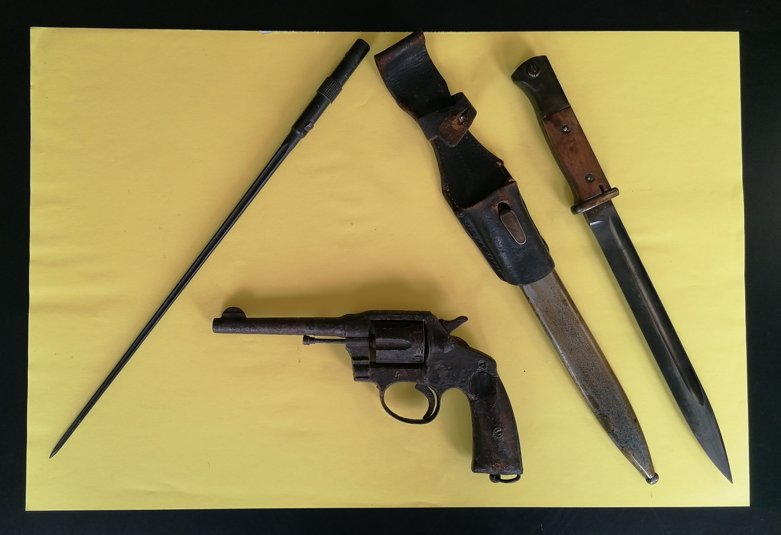 Ces deux baïonnettes, une française (d’un MAS 36) et l’autre allemande (d’un Mauser) ont été découvertes dans une cave abri lors d’un déménagement. Le revolver (qui n’est plus en état de fonctionner) est plus ancien, il a été découvert dans une boite métallique en bêchant un jardin. Ces armes étaient conservées dans la famille depuis ce déménagement.